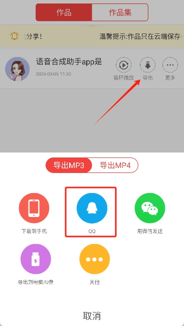 2. 点击【导出】按钮,并在选项中点击【QQ】。