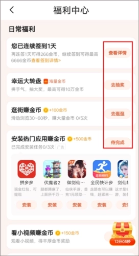 3、在【福利】页面完成福利任务: