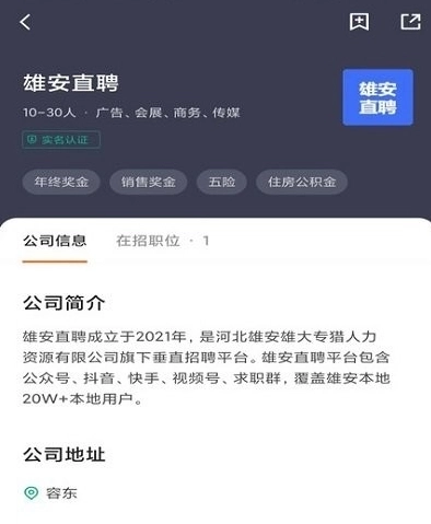 雄安直聘是一款由河北雄安雄大专猎人力资源有限公司推出的线上招聘网站,专为雄安本地的用户打造,提供更加便捷的招聘渠道和服务,让每一个求职者都能够找到自己心仪的工作。在雄安直聘软件中为用户提供了海量的工作岗位,每一个岗位的需求都会展示的非常详细,用户可以根据自己的需求进行筛选查找。找工作,招人才,就上雄安直聘!