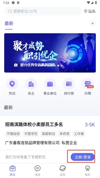 1、首先打开百城招聘,进入到首页中后可以切换到消息、发现、我的页面,我们点击右下方的【登录/注册】;