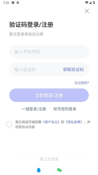 2、在验证码登录/注册的页面中输入上手机号码和验证码后点击【立即登录/注册】即可;