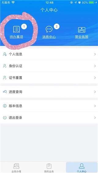3、证书密码设置后回到个人中心界面,点左上角待办事项;