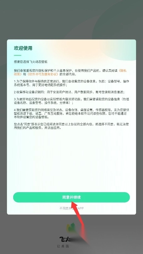 1、初次使用本应用,请务必仔细阅读服务条款与隐私政策,确认内容无误后,点击“同意并继续”按钮,即可进入应用主界面。