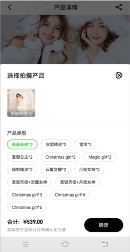 3、选定拍照风格后,进入该风格的详情页面,点击【立即预约】按钮,选好产品类型后点击【确定】即可。