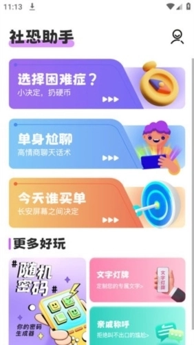 社恐助手是重庆永潇科技有限公司开发的一款服务工具,专门为社恐人士打造。用户可以借助这款软件帮助自己克服社恐,还有超多实用功能等着你来体验!软件里有单身尬聊、选择困难症相关功能,以及各种好用的功能模块,能为大家提供多种抉择方案,让你从此告别社恐和选择困难的困扰。如果你也有这方面的需求,不妨试试这款软件,相信它不会让你失望的!