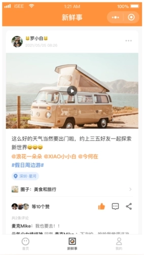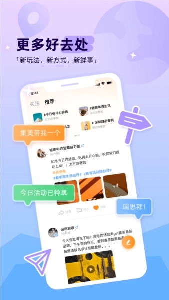 【发现动态】参与活动时那些新奇有趣的体验,都能记录在动态当中。取伙的动态能够关联你加入的圈子或活动,借助这种方式,你可以标记下自己的足迹与心情!
