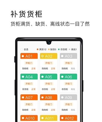 2、高效补货流程:涵盖存货、放货、选货柜环节,通过简化流程,实现对货柜满货、缺货或离线情况的快速响应。