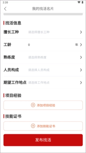 2、完善自己的找活名片,将里面全部信息填写完整,填好后就可以点击下面“发布找活”按钮,企业就会根据你的工作能力招你来应聘相应的岗位。