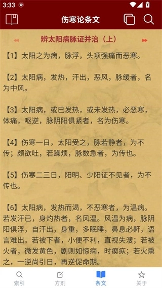 4、清晰呈现条文与方剂内容,同时搭配纸质质感的背景样式,助力用户达成护眼阅读的效果。
