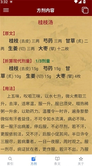 2、在方剂浏览页面,能够展示相关条文供用户阅读,并且支持一键复制剂量以便使用。