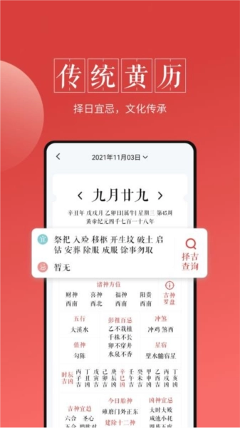 3、可以在软件的进行黄历宜忌快速查询,轻松择吉;