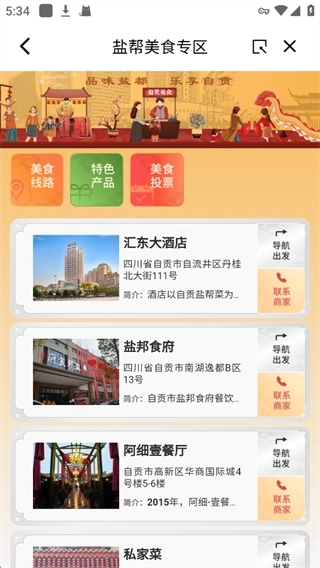 4、这里设有美食路线、特色产品、美食投票等板块,可点击导航开启行程
