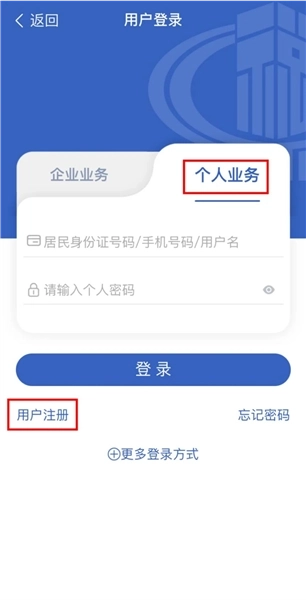 第一步:安装“重庆税务”App,打开后点击首页右上角圆形图标,选择【个人业务】,依次输入用户名、个人密码等信息后登录系统。如果您此前未注册电子税务局账号,可点击左下角【用户注册】按钮,完成注册后进行登录。