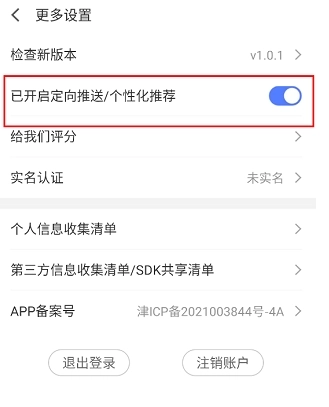 3、然后在打开的新窗口中,找到其中的“已开启定向推送/个性化推荐”,并将其右侧的开关按钮关闭即可。