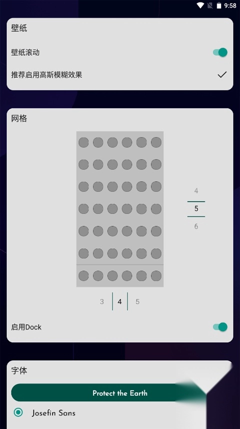 1、打开,设置壁纸滚动、高斯模糊效果,网格形式以及字体等,点击右下角的“√”;