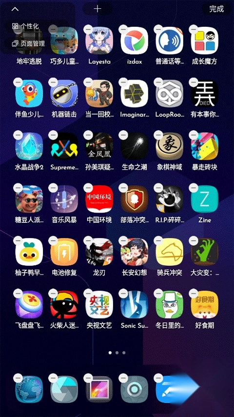 支持多应用同时编辑!操作方法:在编辑模式下,一根手指长按0.3s左右拖动任一应用后,手指不松开屏幕的情况下,另一个手指点击其他即可,应用会自动聚集到第一根手指上!