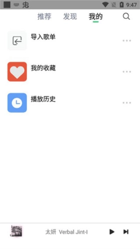 在“我的”这栏里,我们可以导入其它音乐软件的歌单、以及查看播放历史;