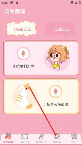 1、进入【宠物翻译】页面后,点击底部的【萌宠知识】选项,即可切换到对应的养宠知识查询板块。
