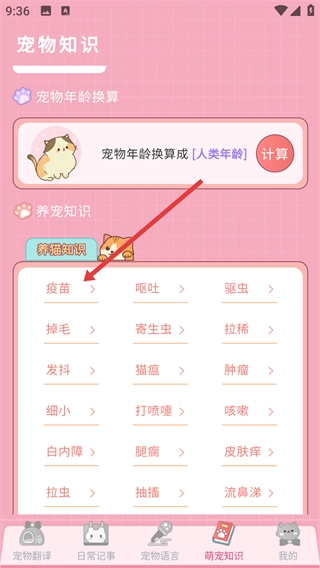 2、进入【萌宠知识】页面后,在养宠知识分类里找到并点击【疫苗】选项,即可进入对应的百科详情页面。