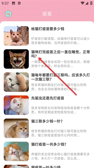 3、在疫苗相关问题列表页面,浏览诸如【给猫打疫苗要多少钱】之类的问题后,选择【猫咪打完疫苗之后一直在睡觉,正常吗?】这一条目。