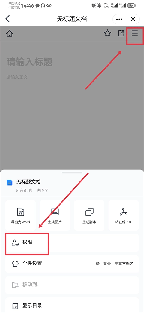 5、然后将文档内容编辑完成后右上角三横线,然后点击权限