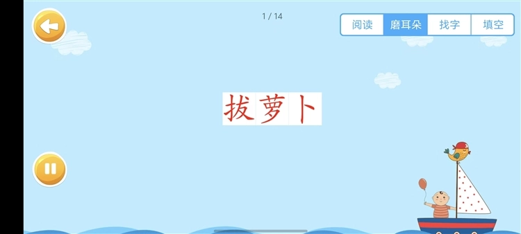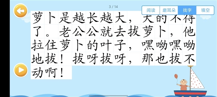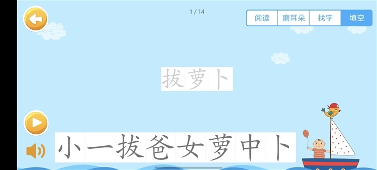在语音提示下,从18个汉字里找出目标汉字,难度适中,能加深对文字的印象。