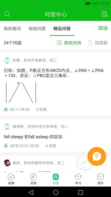 11、划分不同问答专区,问答中心划分了班级问答、区域问答、精品问答等不同专区;